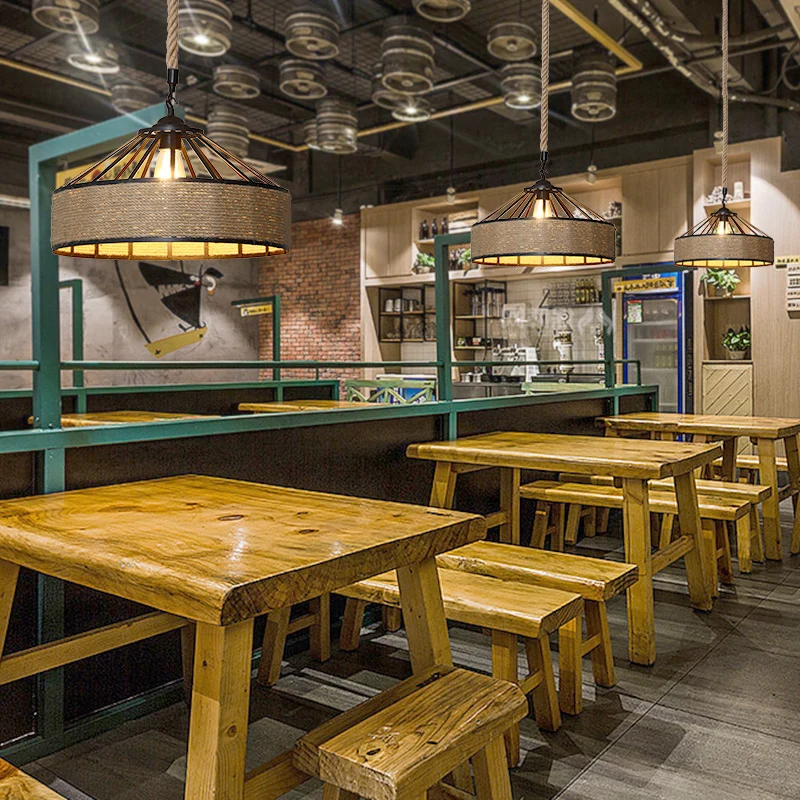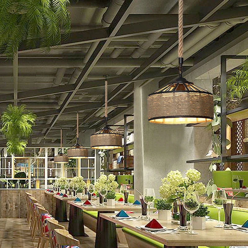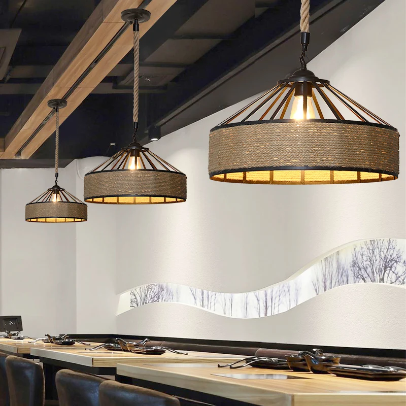 Vintage Industrial Round Iron Hemp Rope Chandelier Hanging Lamp