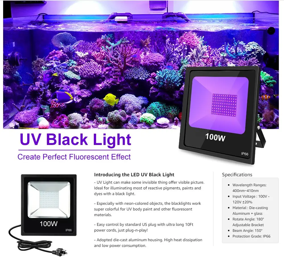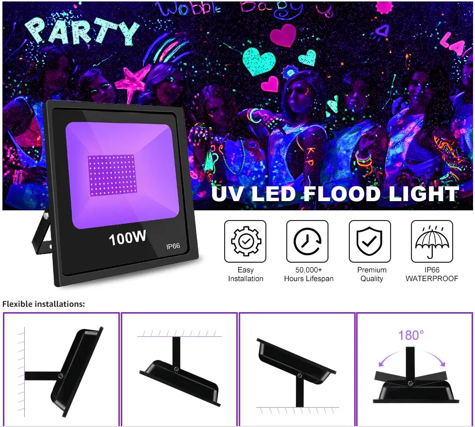 UV LED Black Lights 100W UV LED Blacklight 10ft Power Cords IP66 Ultra Violet Flood Light Stage Lighting party club