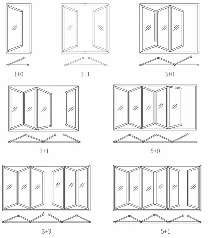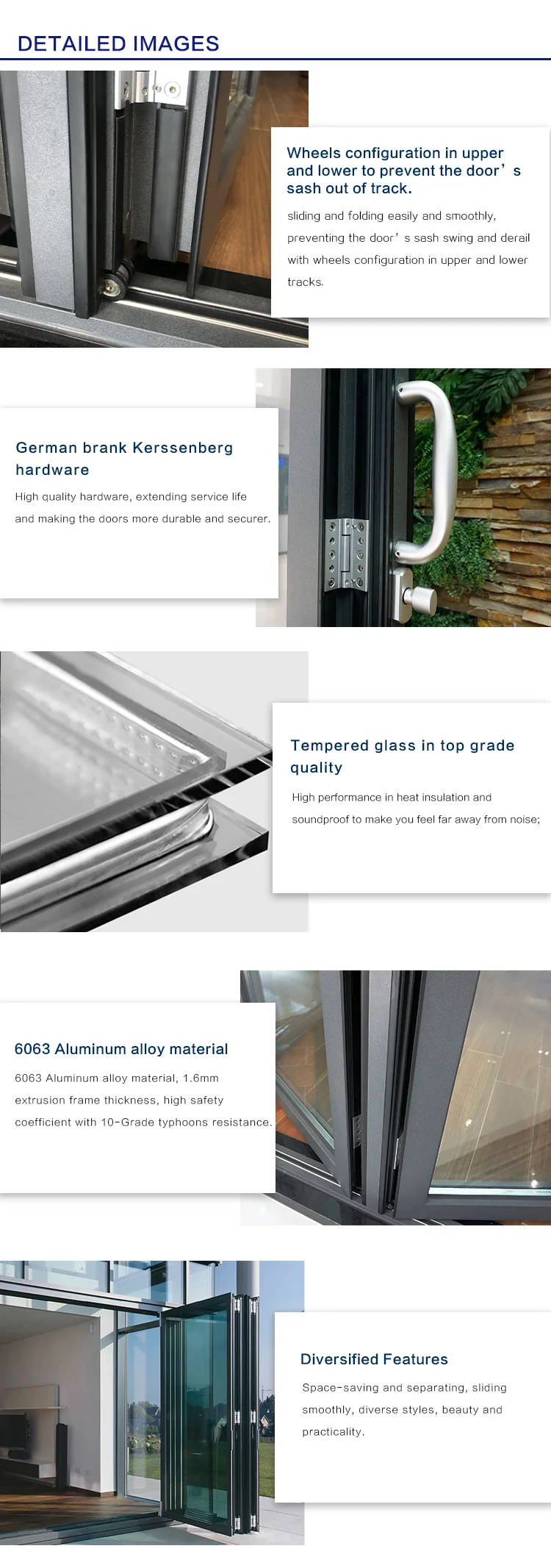 The folding door is beautiful in appearance, novel in style, diverse in color, easy to use, free to push and pull, and effectivel saves the space occupied by the door; folding doors are mostly made of lighter new materials, which are insulated, insulated,moisture-proof, fire-retardant, noise-reducing and noise-proof. It has good performance in acid and alkali resistance andcorrosion resistance. Therefore, folding is especially suitable as a modern bathroom door and kitchen door and balcony door.