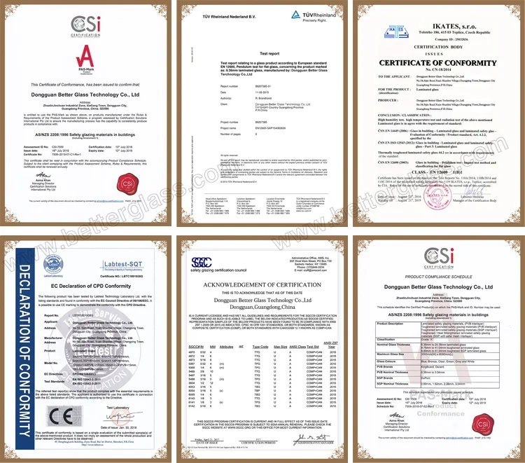 BTG BETTER GLASS produce laminated glass by high quality adhesive interlayer and advanced bond technology. Tempered laminatedglass is produced by adhering two or more pieces of tempered glass together by inyerlayer film like PVB/SGP/EVA. The interlayerfilm will continue to hold the glass together in the event that it is struck or dropped.