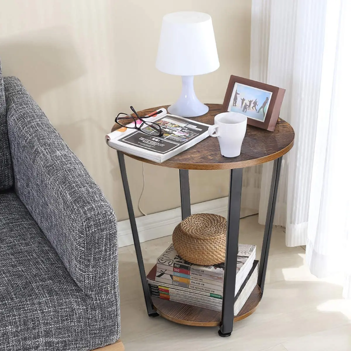 DRM Industrial Round End Table, Wood Look Sofa Snack Table, 2-Tier Vintage Nightstands with Storage Shelf