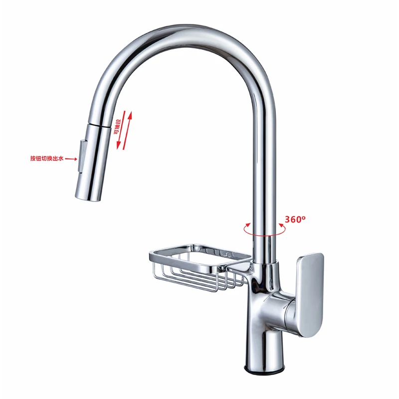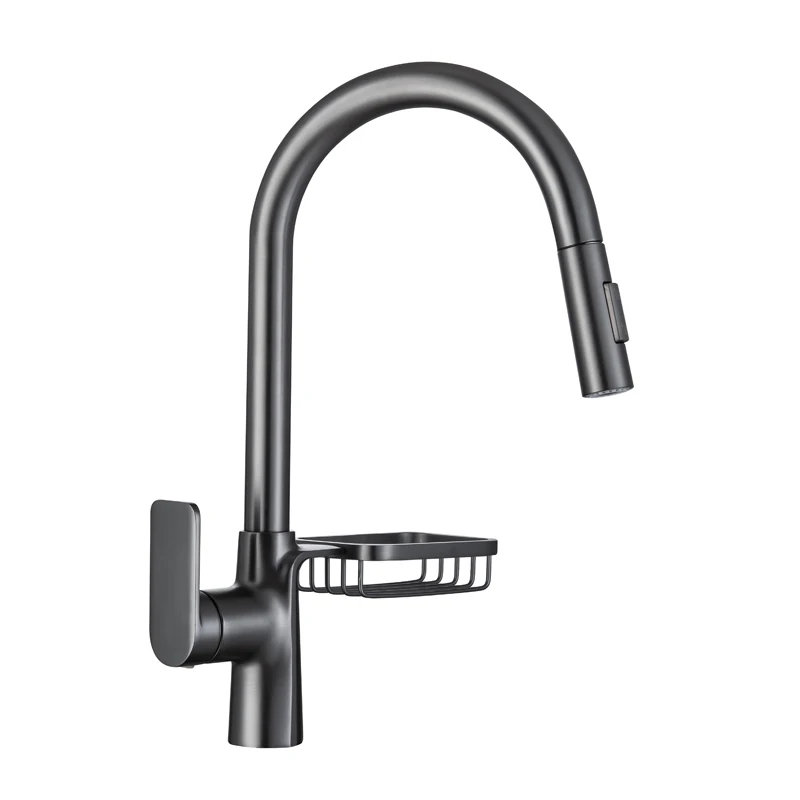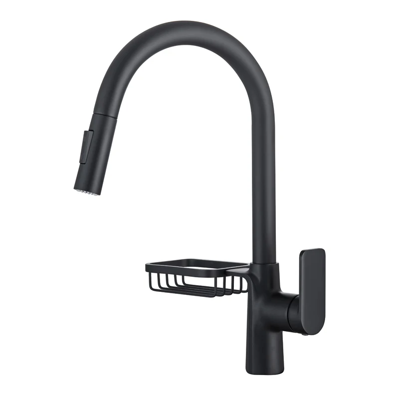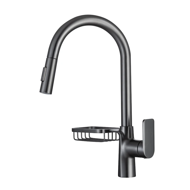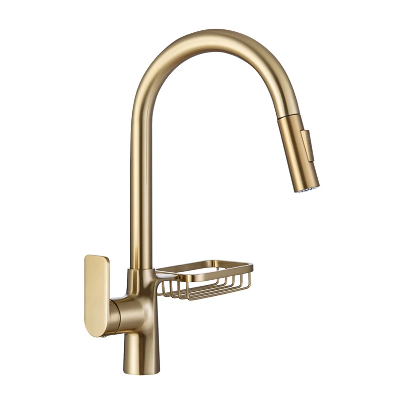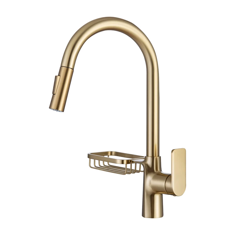 Gooseneck Hot Cold Water Multitask Mode Kitchen Pull Out Sprayer Brass Sink Faucet With Storage Rack