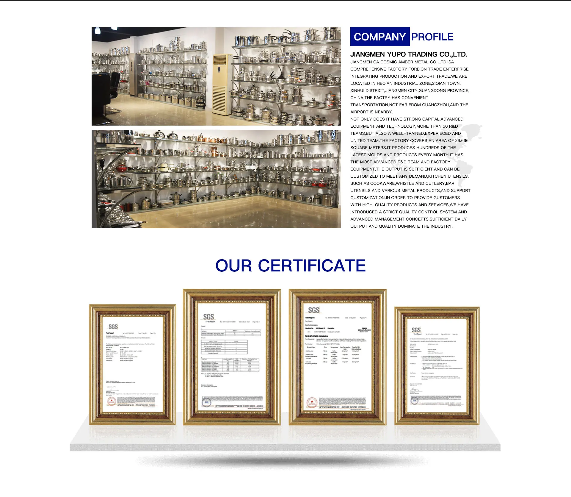 Jiangmen Cosmic Amber Metal Co., Ltd. is a comprehensive factory foreign trade enterprise integrating production and export trade. We are located in Hecun Industrial Zone, Siqian Town, Xinhui District, Jiangmen City, Guangdong Province, China. The factory has convenient transportation, not far from Guangzhou city, and the airport is nearby. Not only has strong capital, advanced equipment and technology, more than 50 R & D teams, but also a well-trained, experienced and united team. We specialize in producing all kinds of stainless steel household kitchen utensils, such as cooker sets, whistle pots and cutlery sets, bar utensils and various metal products, supporting customization. In order to provide customers with quality products and services, we have introduced a strict quality control system and advanced management concepts, with sufficient daily output and quality occupying a dominant position among peers.
