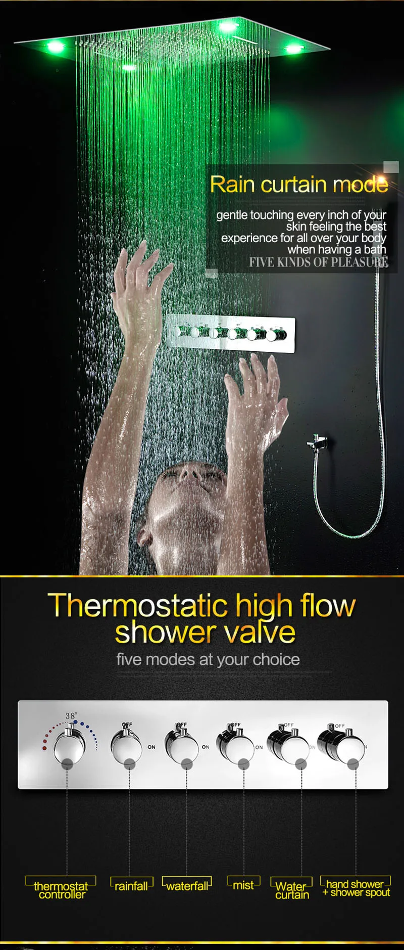 High Quality Shower System Spa Mist Waterfall Bath Thermostatic Faucets Mist Shower Head Led Recessed Rain Set