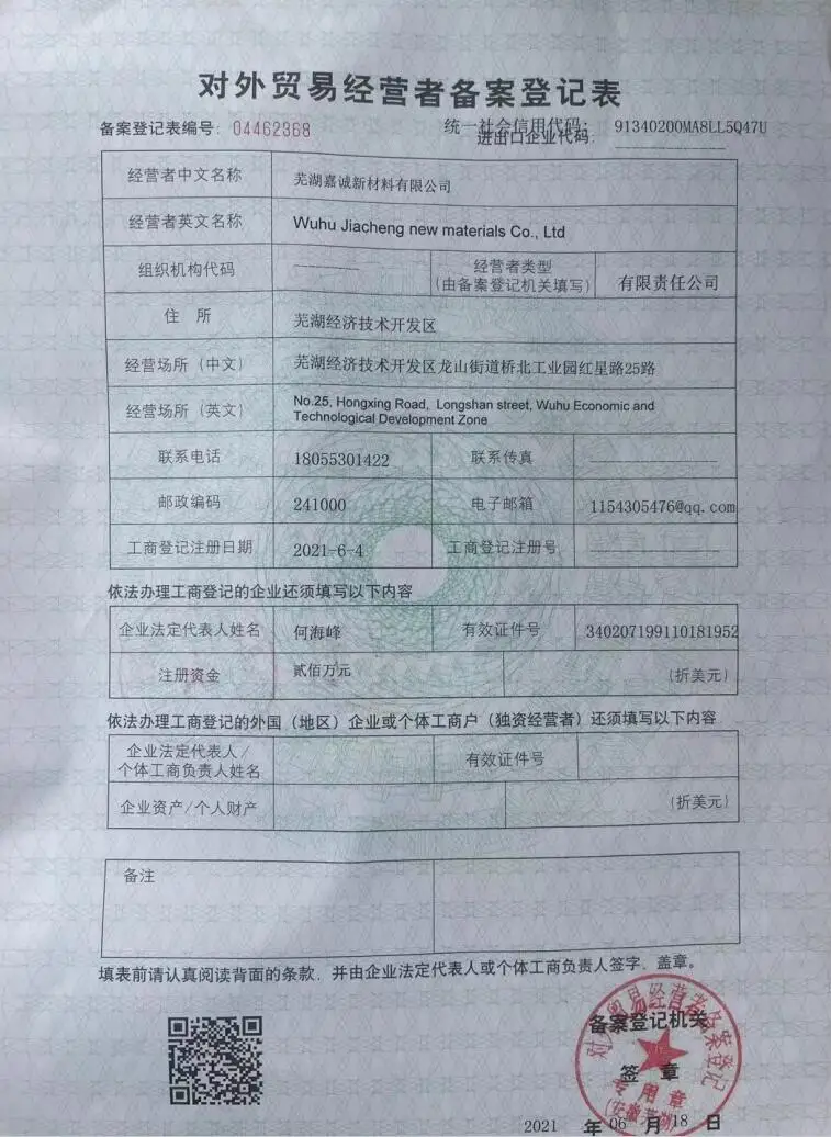 Wuhu Jiacheng New Material Co., Ltd is a new manufacturer and trader specialized in the research,