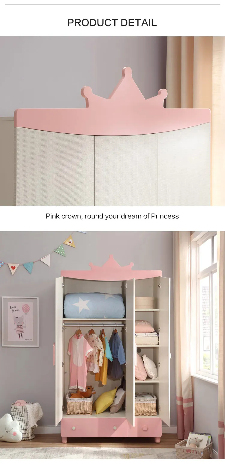 Linsy 3 Door Solid Wood Kid Room Girls Baby Portable Wardrobe Organizer Pink Wooden Kids Clothes Cabinet Storage EA1D