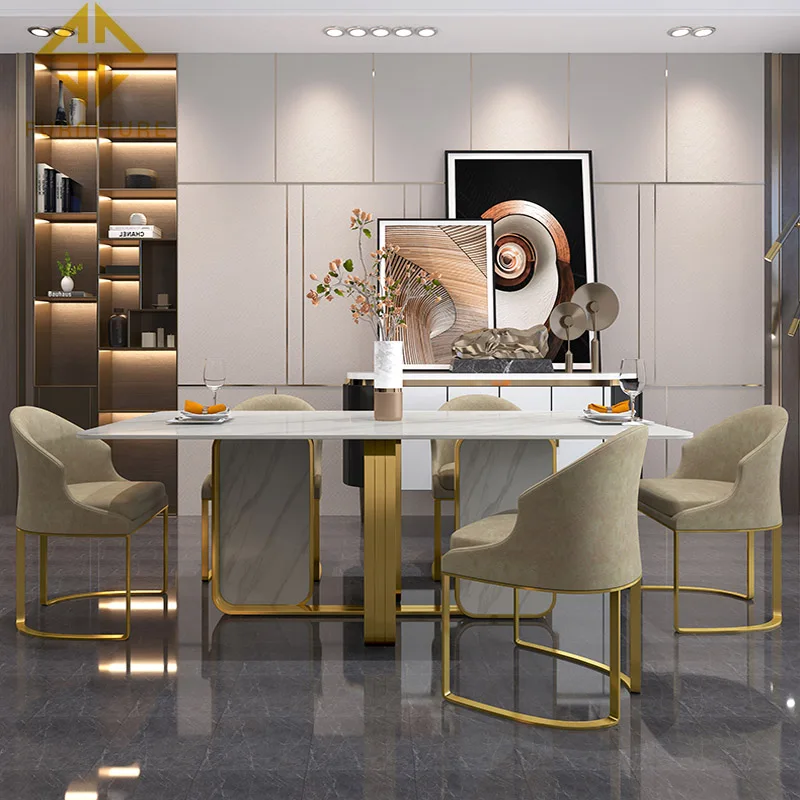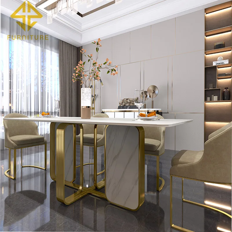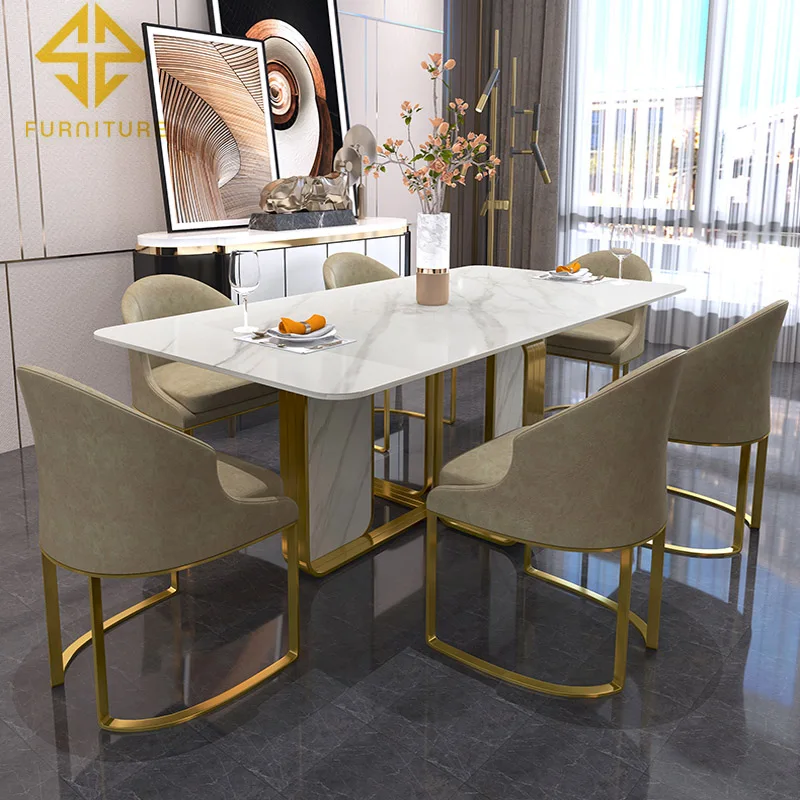 Modern style unique design gold marble table and 6 chairs dining room set