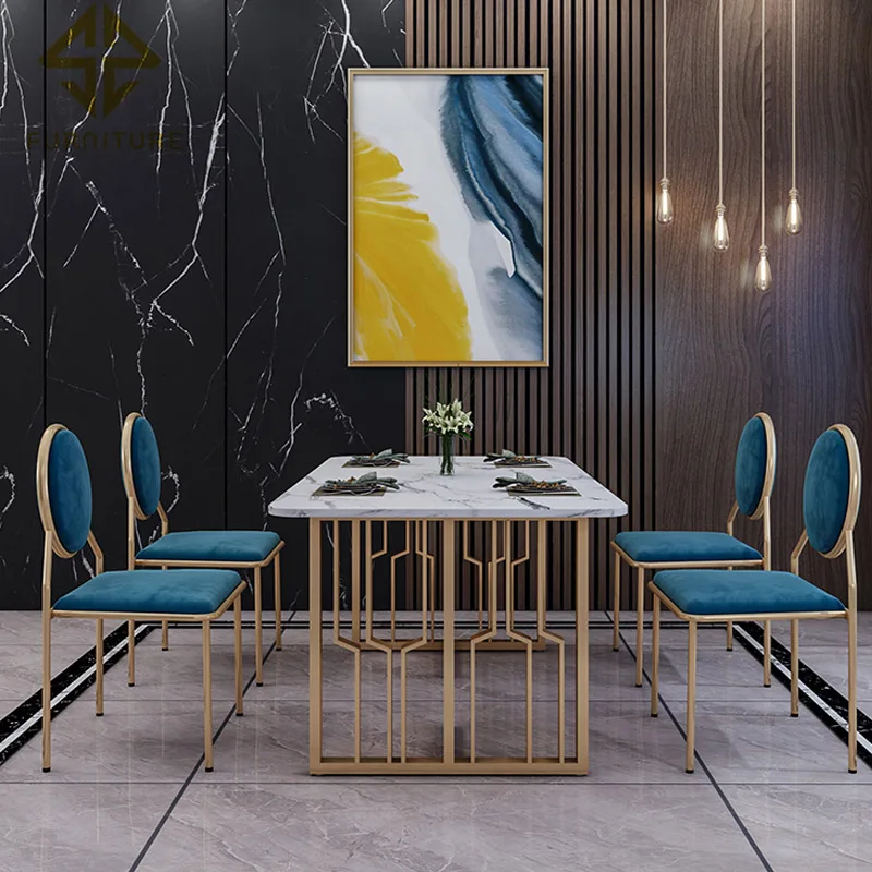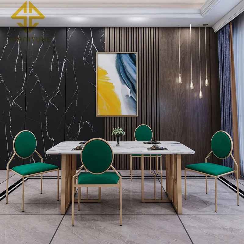 Modern luxury designs gold stainless steel frame base marble top dining table set
