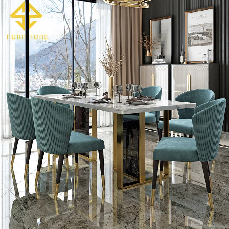 Modern luxury design gold frame and black marble top dining room table set with 6 seater
