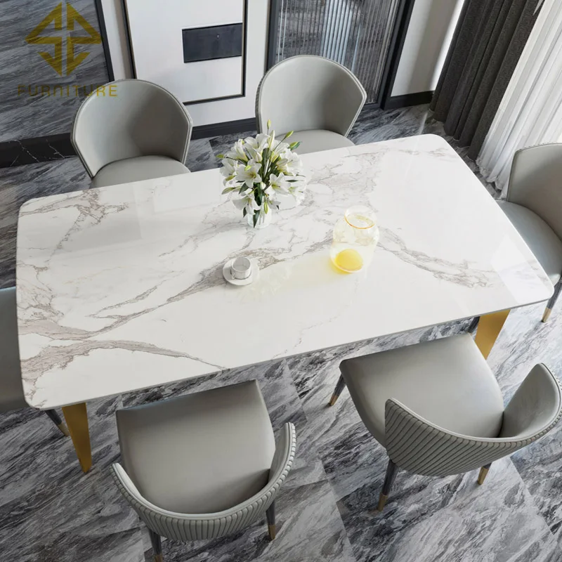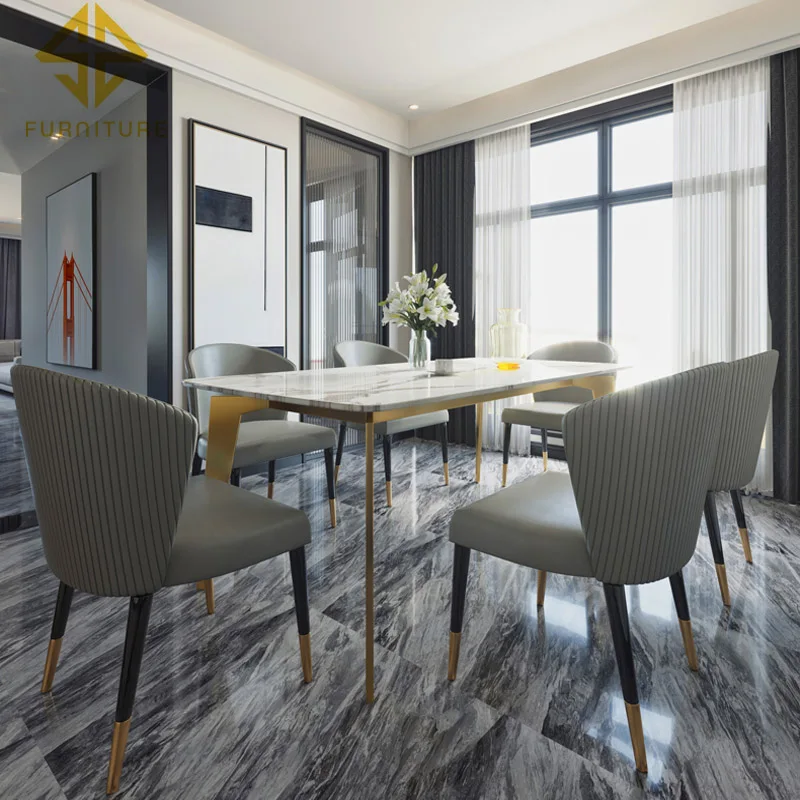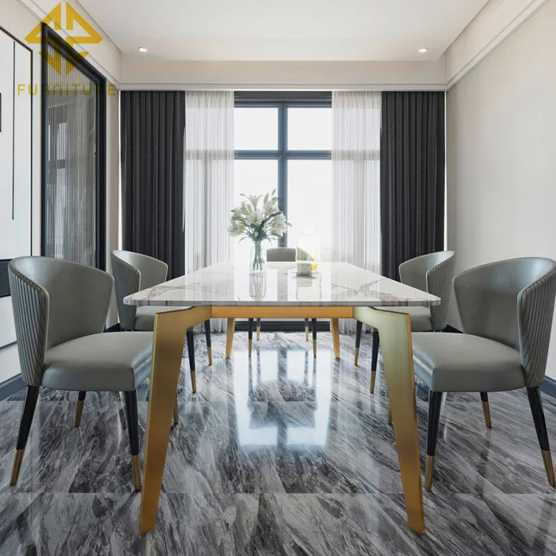 Modern luxury home furniture gold steel frame marble dining room table and chairs