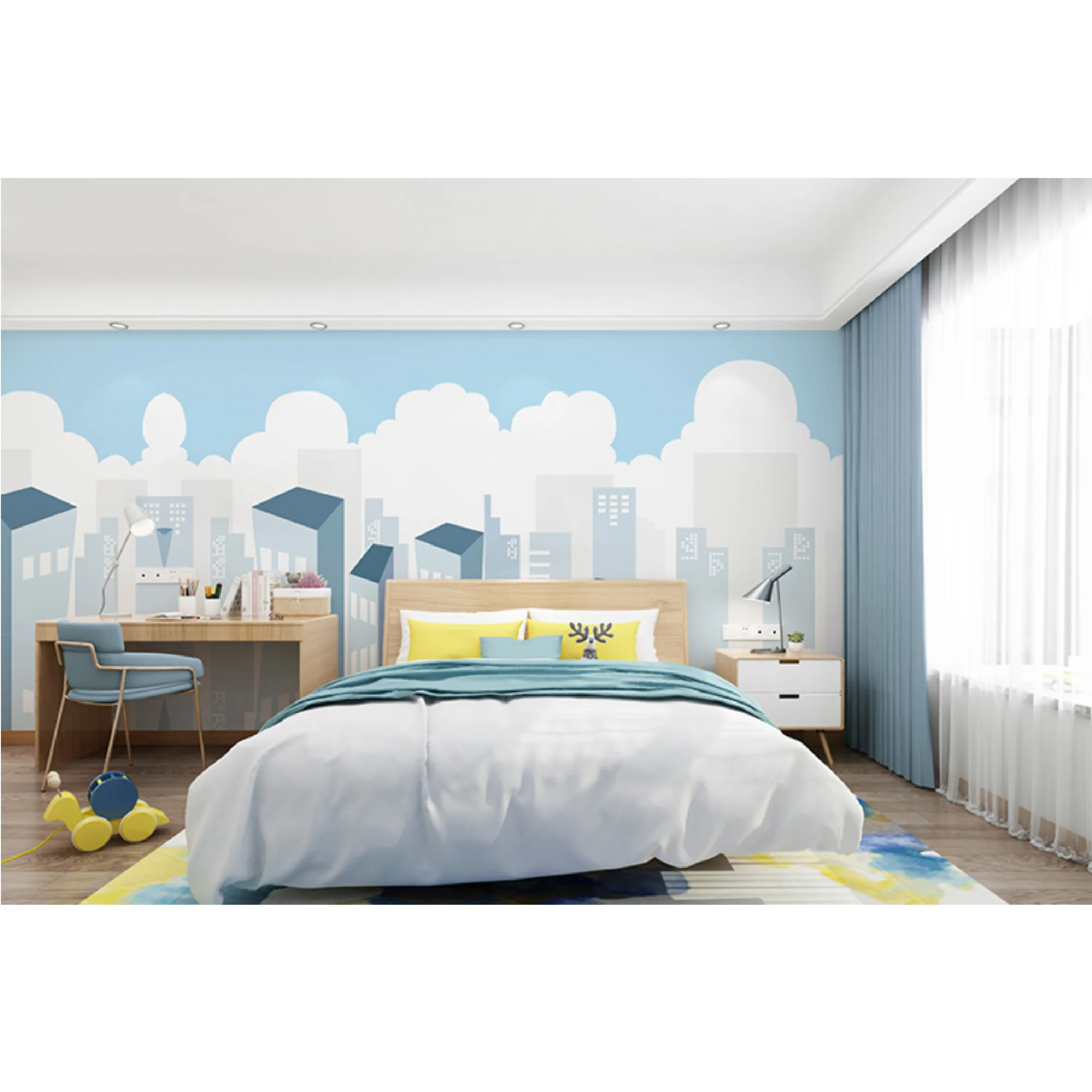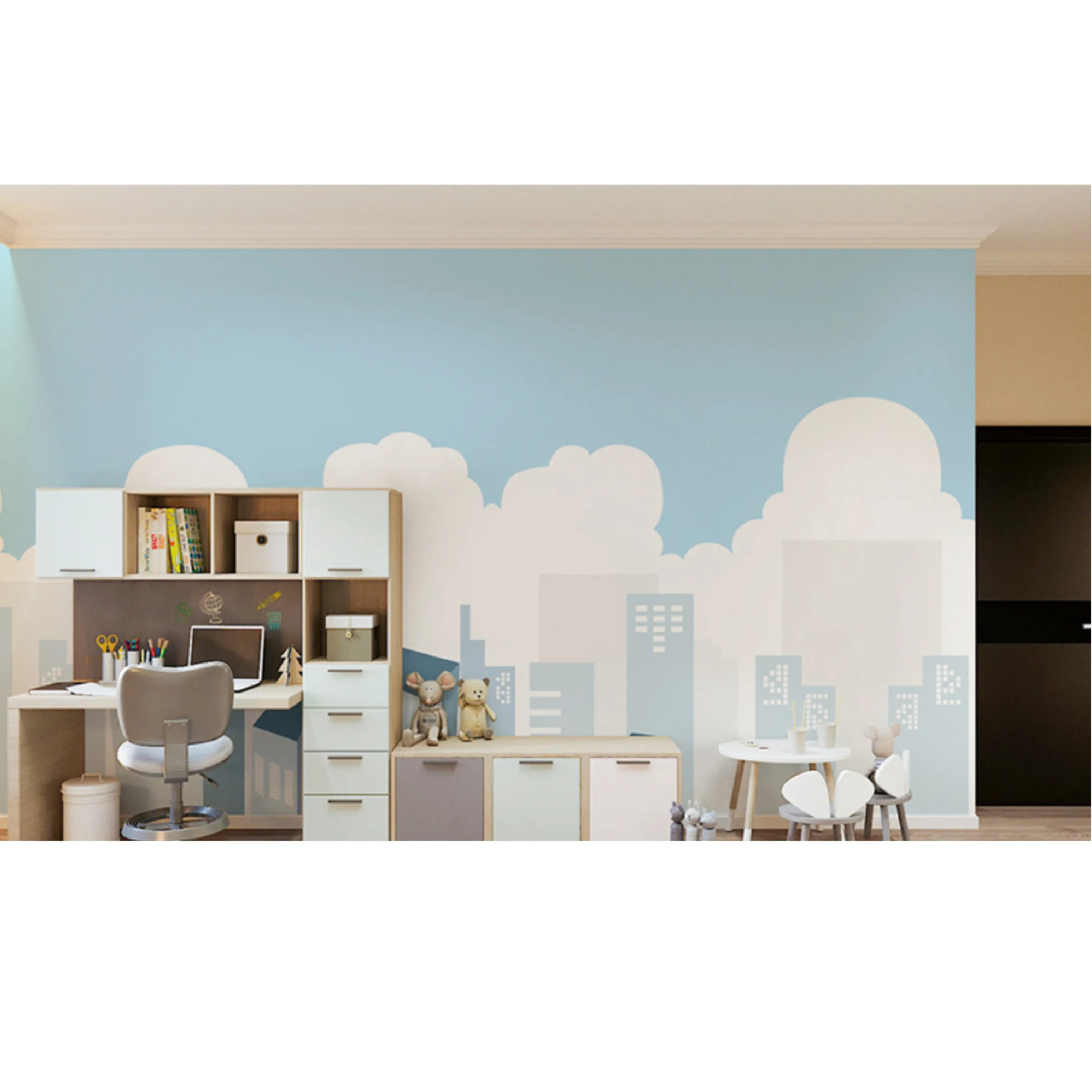Home Stone,Tiles,Flooring & Walls Material Interior Wall Material Wallpaper Anhui Modenisite Soft Decoration Design Co., Ltd. Children's room cartoon style blue sky and architecture background wallpaper