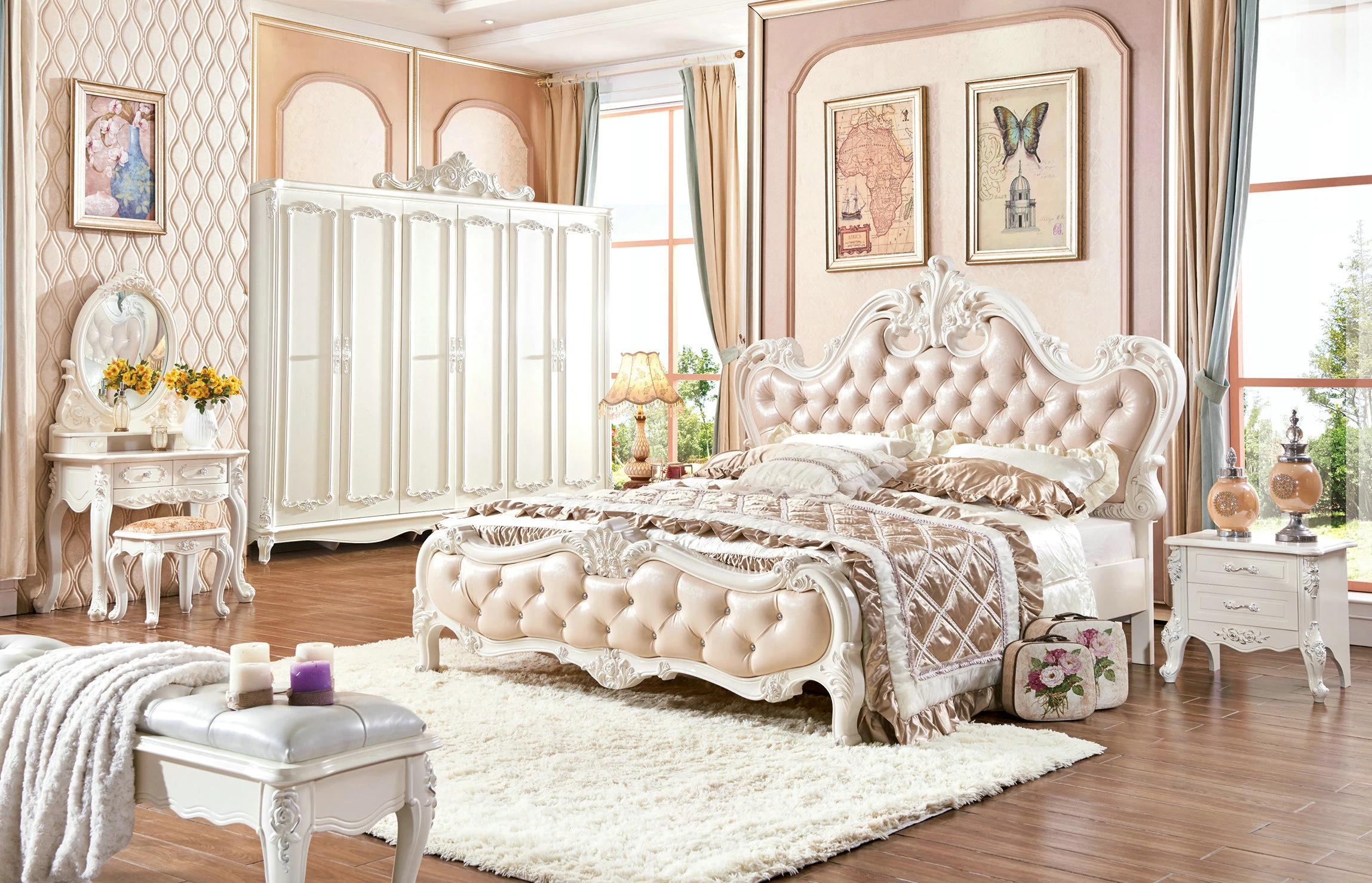 White Color European-Style Master Bedroom B4010# Luxury Carved French Royal Leather Bed