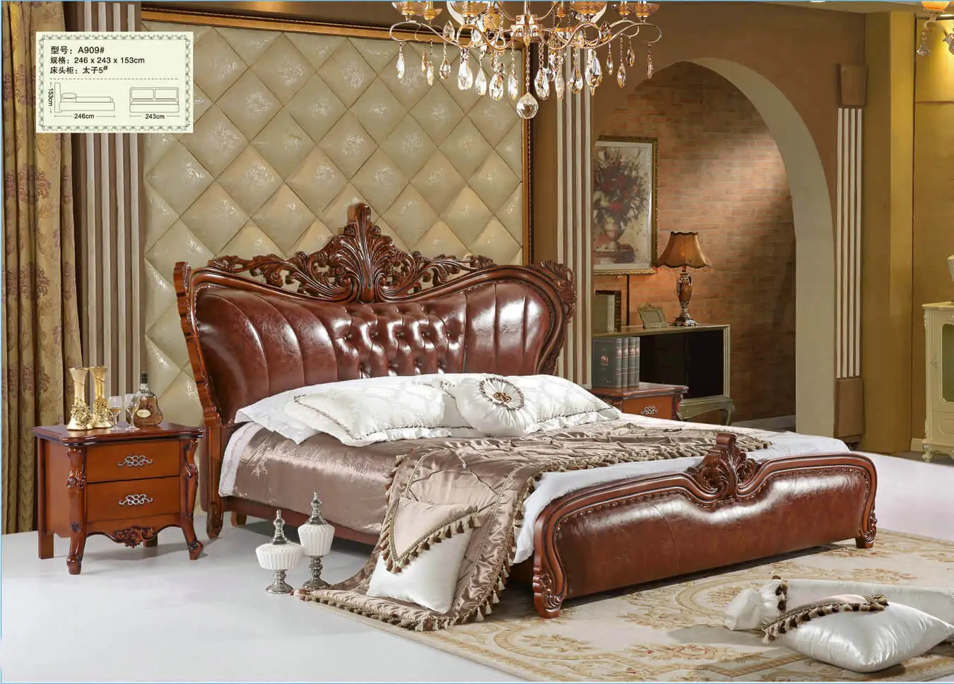 European Style brown color Master Bedroom sets Luxury Carved French Royal Leather Bed