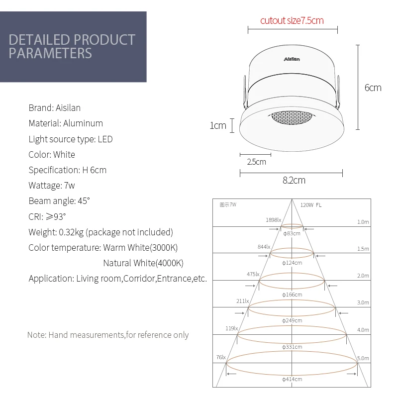 Aisilan high quality uk standard commercial home hotel hall 7watt 4000k ceiling spot led light cob recessed down light