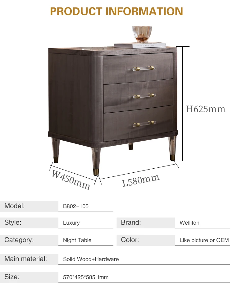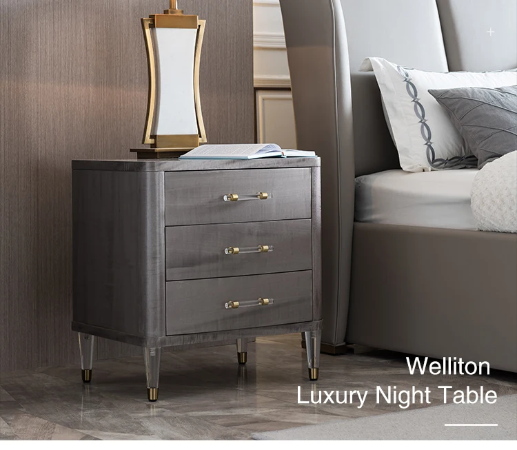 Welliton OEM Luxury Style Bedroom Furniture Solid Wood Modern Bedside Table With Drawers