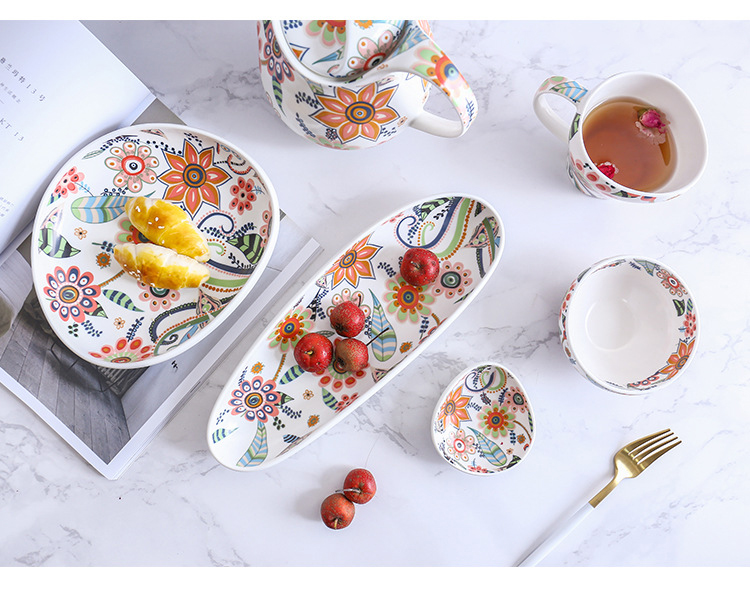 Ethnic Style Roast Flower Pattern Dinnerware Set Porcelain Teapot Teacup Ceramic Platter Rice Bowl