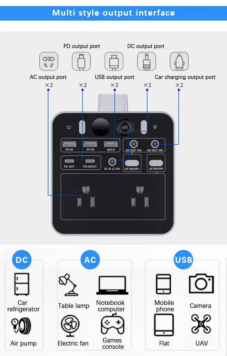 Special Features | Type C, Flashlight, jump starter, RV Port, Cigar Lighter, Air Compressor, External Battery |