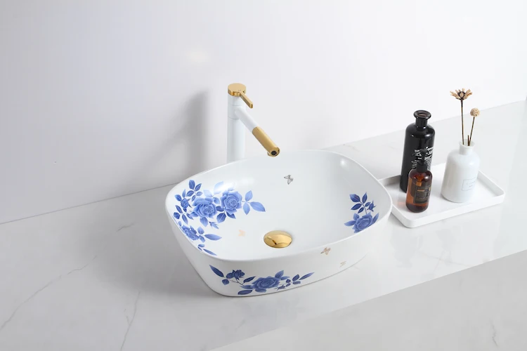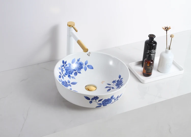 Top 1 sale Oval blue and white pottery design white color basin bathroom ceramic countertop bowl sinks