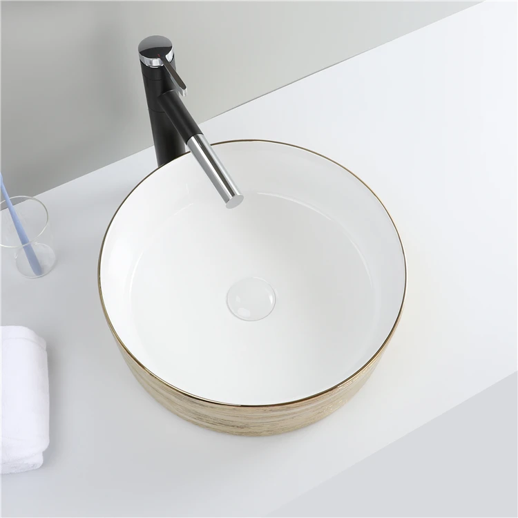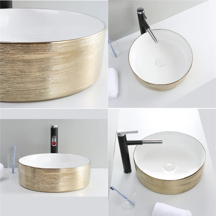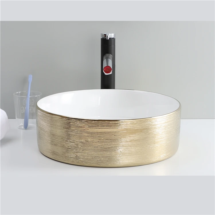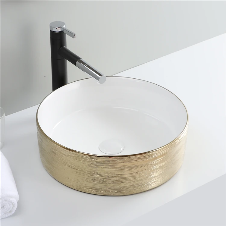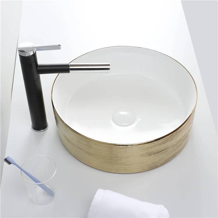 Home Bathroom Products,Sinks Wash Basin Chaozhou City Chao'an District Dengtang Town, Hengmei Ceramic Factory Hot Sale Sink Glossy White And Gold Countertop Lavabo Modern Luxury Ceramic Bathroom Wash Hand Round Shape Art Basin